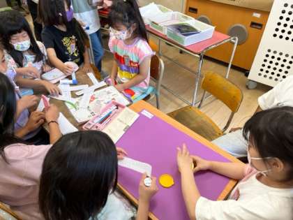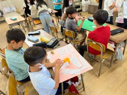 6月2日(木)1時間目、2年2組は生活科で町たんけんをして発表したことに対して友だちからの「わかったこと」」や感想のメモを色画用紙に貼って整理していました。