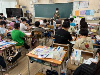 6月3日(金)1時間目、5年2組は図工で自分の名前を立体化したものに色をぬっていました。グラデーションをつけている子もいました。