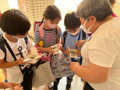6月3日(金)3年生は一人一頭カイコの幼虫を家へ持って帰り世話をするようです。下校時にカイコの先生が訪ねてきてくださったのを知った子どもたちが、自分の幼虫を見せにきました。幼虫に名前もついていました。まゆを作るまでしっかり世話をし観察してほしいと思います。