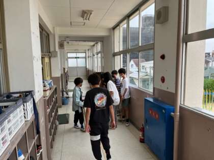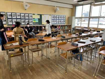 6月16日(木)1時間目、6年生は1組も2組も「粉浜まつり」の準備をしていました。教室の中の机の配置を確かめ、店の案内の練習をする等をしていました。