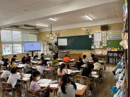 6月16日(木)2時間目、1年1組は算数で「ぜんぶで いくつに なりますか。」という問題を式を書いて求めていました。