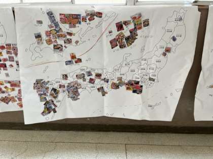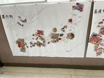 6月20日(月)5年の廊下に1組も2組も食料の産地マップが貼られていました。1組は農作物、畜産物、水産物に分けられていました。
