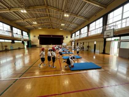 6月20日(月)2時間目、1年2組は体育でマット運動をしていました。前回りや後ろ回りの練習をしていました。