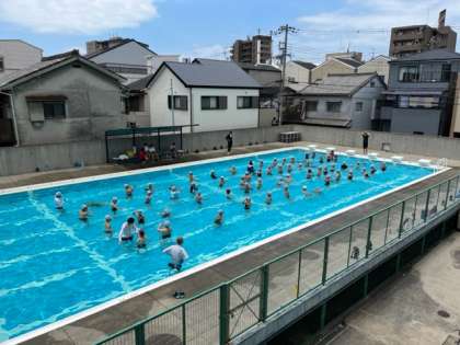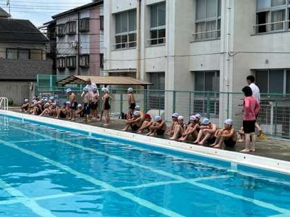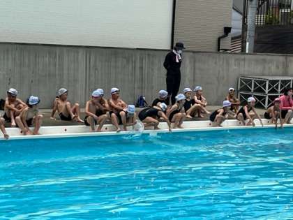 6月23日(木)3時間目、4年生はプール開きがありました。最初に子どもの位置決めを丁寧にしていました。