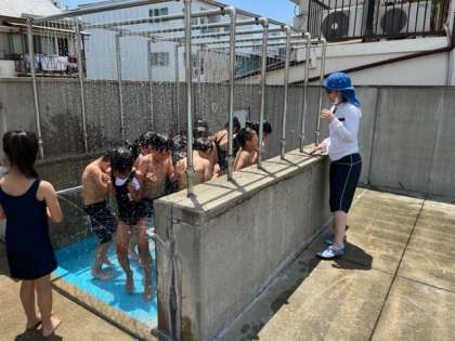 6月24日(金)3時間目、1年生はプール開きを行いました。プールサイドでの位置を決めたり、足洗場、シャワーの使い方、プールへの入り方等と今日はすることが盛りだくさんでした。慣れてくると水に入っている時間が増え、もっと楽しくなりますね。
