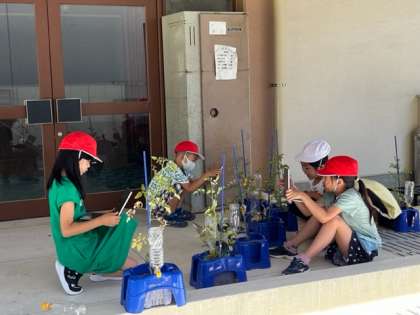 6月29日(水)1時間目、2年1組は生活科でミニトマトの観察をしていました。一人一台のパソコンを使って写真を撮っていました。教室の黒板には「形」「色」「大きさ」「におい」手触り」「数」等が書かれていましたので、そういう視点でも観察できたのでしょうか。