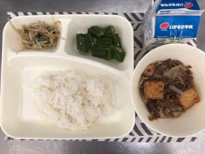 旬のオクラが登場するようになりました。カロテンやビタミン類が豊富です。体の免疫力を高めてくれる緑黄色野菜です。今日はかつお粉末や梅肉を使った献立でした。