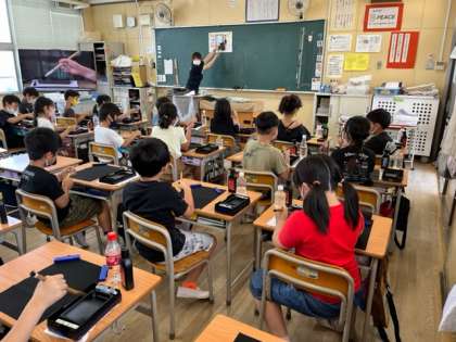 7月1日(金)1時間目、3年1組は書写で毛筆の学習をしていました。黒い服を着ているひとが多いようです。墨がついても目立たない服なのですね。