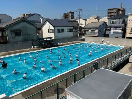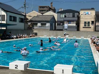 7月1日(金)1時間目、6年はプールで着衣泳をしていました。水着の上から体操服を着て浮いたり、泳いだりしていましたが、なかなか難しそうです。ビート板1枚で顔を水から出して呼吸できるようにチャレンジしていました。