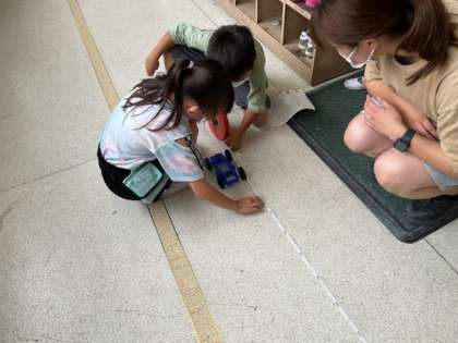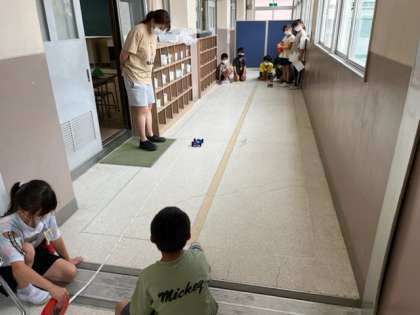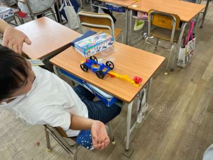 7月4日(月)1・2時間目、3年2組は理科で風やゴムのはたらきをウインドカーを作って調べていました。「プラモデルや。」と言う子もいましたが、楽しんで作っていました。できた車を廊下で走らせ記録をとっていました。