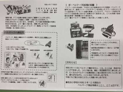 明日、ベルマークだよりを配付します。一緒に配付します封筒にベルマークをためていただき、たまりましたらお子様を通じて学校へ持ってきてください。各教室に回収箱がありますので、そちらに入れてください。なお、今年度より回収箱が一新されましたのでお間違いのないようお願いいたします。