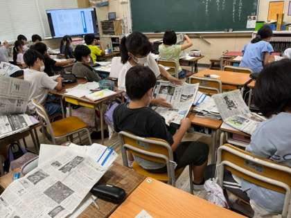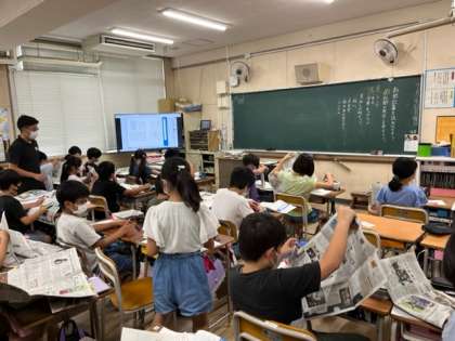 7月4日(月)2時間目、5年2組は国語で「新聞記事を読み比べよう」を学習していました。実際の新聞を使い、見出しのつけ方の特徴を考えていました。