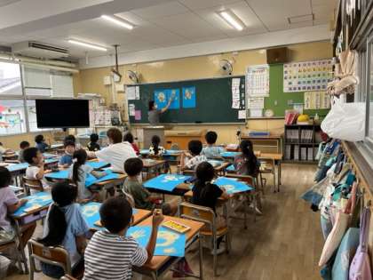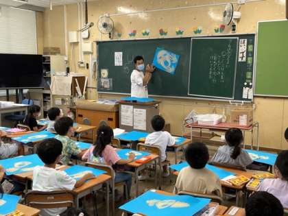 7月4日(月)2時間目、1年生は1組も2組も図工で水色の画用紙に顔や手を描いていました。このあとどうなるのでしょうか?