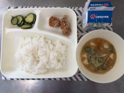今日の豚肉のたつたあげは、しょうが汁と濃口醤油と料理酒で下味をつけて、でんぷんをまぶして揚げています。みそ汁には、夏が旬のかぼちゃやオクラをはじめ、えのきたけ、たまねぎ、豆腐が入っていました。