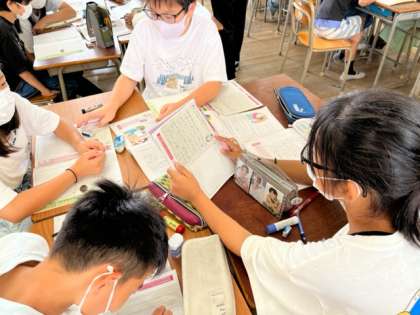 7月6日(水)1時間目、6年1組は道徳で「カスミと携帯電話」を学習していました。携帯電話について班で話し合っていました。「携帯電話の使い方が分かってから使った方がいい」や「携帯電話を使わせるお家の人にも問題がある」など、積極的にノートに書き話し合いをしていました。