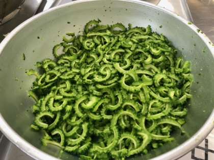 ゴーヤは苦みがあり苦手な児童が多い野菜ですが、1年生は「苦手だけどがんばって食べたよ!」「マヨネーズかけたら食べれた!」と教えてくれました。