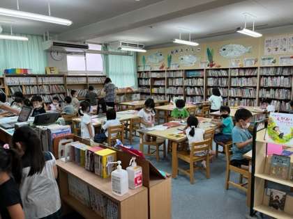 7月12日(火)4時間目、1年2組は図書で夏休みに読む本を借りていました。