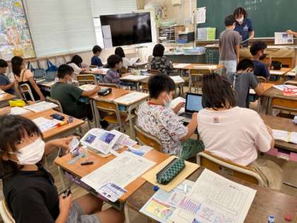 7月15日(金)2時間目、4年1組は新聞をつくっていました。新聞のタイトルがおもしろいなあとおもいました。「じょう水じょう水きれい新聞」「じょう水場のしくみ新聞」タイトルを見ただけで何を学習しているかわかりました。