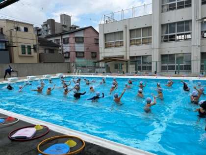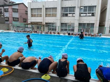 8月26日(金)2時間目、2年生は体育でプール水泳でした。音楽に合わせて水慣れをしていました。プールサイドにフラフープが置いてありましたので、この後、フープを使ってもぐったりしたものと思われます。