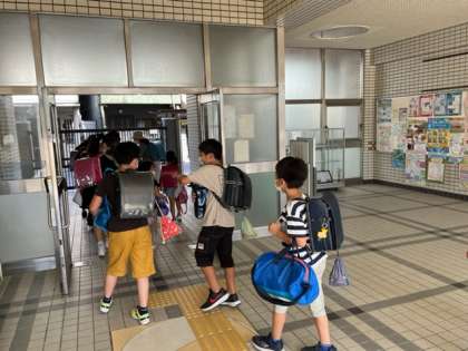 8月31日(水)5時間目に台風接近時の避難訓練をしました。地区ごとの教室に集合し、集団下校しました。いきいき活動に参加する人以外、下校の混雑を避けるために正門と南門に分かれて下校していきました。6年生や5先生の指示のもと並んで下校しました。