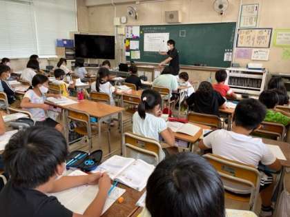 9月8日(木)2時間目、4年2組は算数で方眼を使って垂直や平行をかく方法を考えていました。