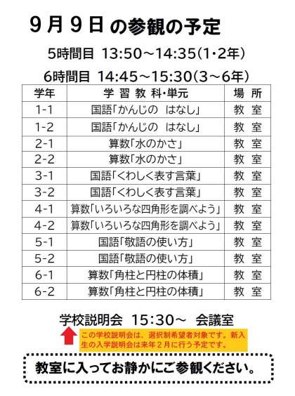 明日は学習参観です。上記の通りご予定お願いいたします。なお、15:30より予定しております、「学校説明会」は選択制希望者対象のものです。来年度入学予定者向けの「入学説明会」は来年2月に予定しておりますので、お間違いのないようにしてください。