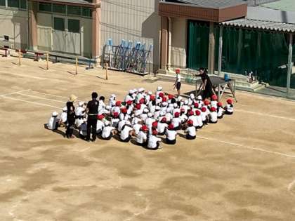 9月13日(火)1時間目、4年生は体育でリレーのバトンパスの練習をしていました。はじめは、先生からバトンの受け渡しの仕方を実演を交えて聞いていました。あとから、グループごとに練習しました。