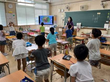 9月14日(水)英語タイムで2年1組は道後に合わせて英語で歌いながら動作をしていました。キャンプファイヤー等でよくする「トウチェンバン」の英語版でした。