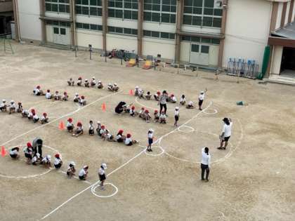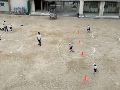 9月20日(火)2時間目、1年生は運動場で回せんリレーの練習をしていました。走るコースがわからず、やりなおししている子が結構いました。