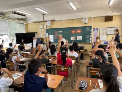 10月3日(月)2時間目、6年1組は歯と健康教室がありました。口の中をきれいにするには唾液が必要で、唾液を出すには、たくさん噛む必要があります。そこで、おにぎりを一口食べて何回かむかを想像して飲み込んだら手をおろすことをしました。3時間目には6年2組が学習しました。