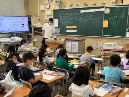 10月6日(木)1時間目、1年2組は算数で8+3の計算の仕方を考えていました。10のまとまりを作って計算するとまとめていました。