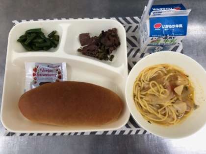 ほたて貝には大きな貝柱があり、給食ではこの貝柱を使っています。貝柱にはうまみがたくさん含まれており、今日のスープスパゲッティには、下茹でしたほたて貝のゆで汁も使っています。