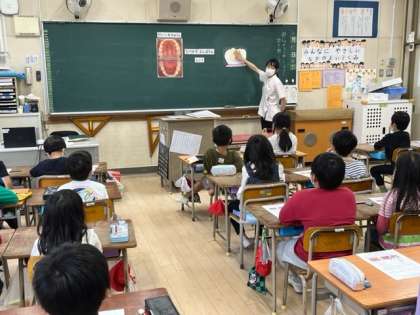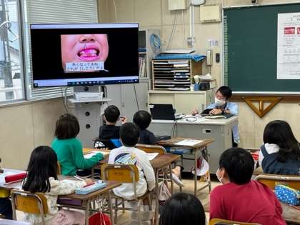 10月7日(金)3時間目、2年2組は歯みがき指導を受けました。・むし歯になるメカニズムを知った上で、歯のみがき方を学習しました。マスクをつけていますので、実際に歯をみがくことはできませんので、動画でみがき方を学びました。