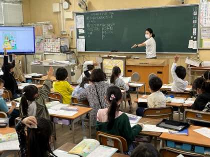 10月18日(火)1時間目、1年1組は算数で5+6になる問題を作っていました。たし算に使う言葉を確認していました。「ぜんぶで」「あわせて」「ふえると」「みんなで」のような言葉があります。