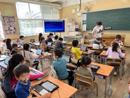 10月18日(火)3時間目、1年1組はタブレットで「じゆうにつくるビスケット」をしていました。