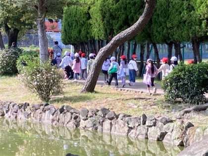 10月25日(火)1〜2時間目、1年生は生活科で住吉公園の探検に出かけました。自然のものだけでなく、人のこと、目に見えないことも感じたり発見したりすることができたでしょうか?