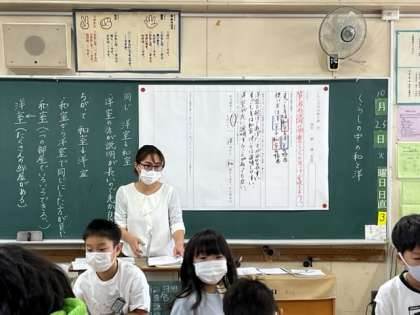 10月25日(火)4時間目、4年1組は「くらしの中の和と洋」を学習していました。筆者の説明の順番のくふうを見つけて交流していました。