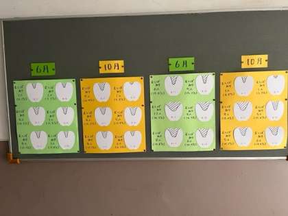 11月4日(金)保健室前の掲示板に学級ごとに虫歯のある人の数が示されていました。6月と10月が比較できるようになっていました。