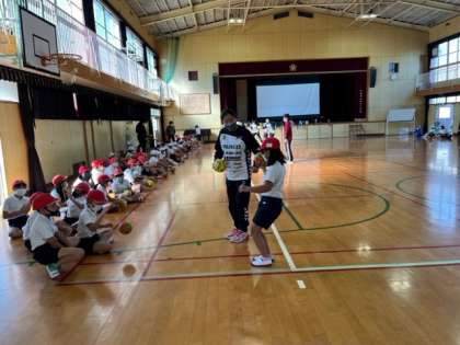 11月8日(火)2時間目、4年生はトップアスリートによる出前授業でハンドボールの体験をしました。大阪ラビッツというハンドボールチームの方に教えていただきました。ボールをバウンドさせて、左右左、止まる等リズムにのって前へ進むところから、シュートの練習までしました。