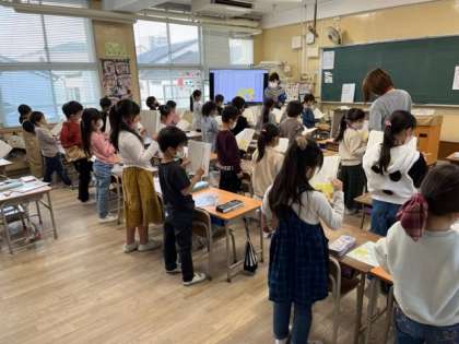 11月10日(木)1時間目、1年1組は国語で「おとうとねずみ チロ」の音読をしていました。