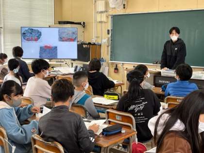 11月14日(月)1時間目、6年2組は理科で「大地のつくり」を学習していました。れき岩、砂岩、でい岩について調べていました。