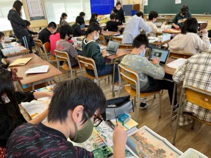 11月17日(木)1時間目、6年1組は浮世絵の仕上げをしている人や、卒業文集を書いている人や、デジタルドリルをしている人など、自分のできていないことを集中して取り組んでいました。