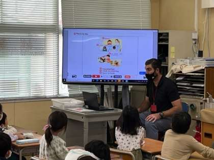 11月17日(木)2時間目、1年2組は外国語活動で学校へ行くまでの朝のようすを英語でどのようにいうのかを聞いていました。