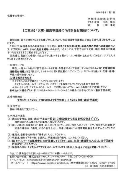 本日、再度お手紙を配付しましたが、21日(月)から「欠席・遅刻連絡のWEB受付」が始まります。