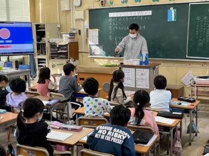11月25日(金)1時間目、1年2組は算数でかさの比べ方を考えていました。教卓に2本のペットボトルがありましたので、この2本のかさを比べたのでしょうか?