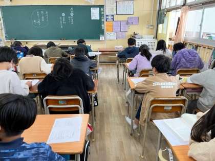 12月2日(金)1時間目、6年1組は社会科のノートをまとめたりプリントをしたりしながら、合奏のパート決めの話し合いをしていました。