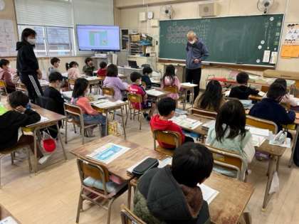 12月7日(水)1時間目、2年2組は算数で1の段の九九とリンゴの数を求める問題を学習していました。