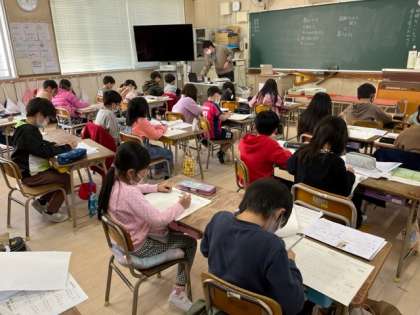 12月9日(金)3時間目、2年2組は音楽で歌のテストをするようです。順番を待っている間に国語や算数のプリントをしていました。