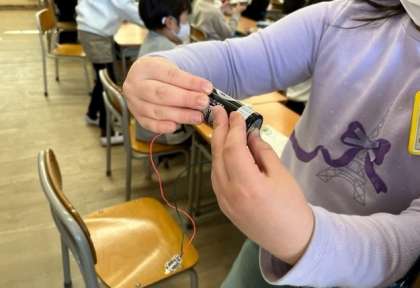 12月9日(金)3時間目、3年1組は理科で豆電球と乾電池をつないで明かりを灯していました。