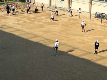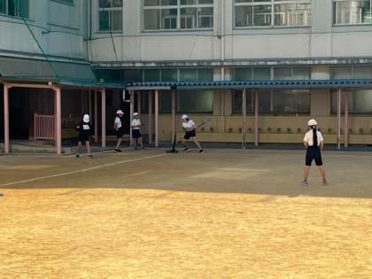 12月9日(金)4時間目、6年1組は体育でTボールをしていました。日差しを浴びて楽しんでいました。